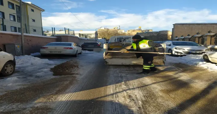 Kamu kurum binaları, okul ve cami önleri başta olmak üzere yoğun kullanılan alanlarda kar temizleme ve tuzlama çalışmaları aralıksız sürdürülüyor.
