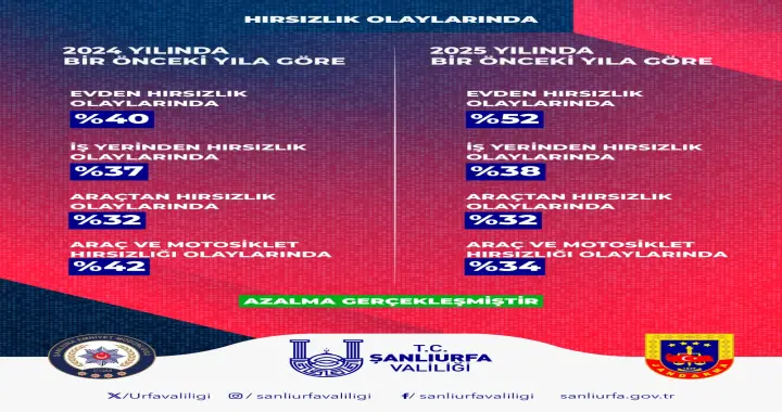 Son olarak hırsızlık olaylarına ilişkin bilgilerin yer aldığı paylaşımda; 2024 yılında bir önceki yıla göre evden hırsızlık olaylarında yüzde 40, iş yerinden hırsızlık olaylarında yüzde 37, araçtan hırsızlık olaylarında yüzde 32 ve araç motosiklet hırsızlığı olaylarında yüzde 42 azalma görülürken, 2025 yılında bir önceki yıla göre evden hırsızlık olaylarında yüzde 52, iş yerinden hırsızlık olaylarında yüzde 38, araçtan hırsızlık olaylarında yüzde 32 ve araç motosiklet hırsızlığı olaylarında yüzde 34’lük azalma dikkat çekti.