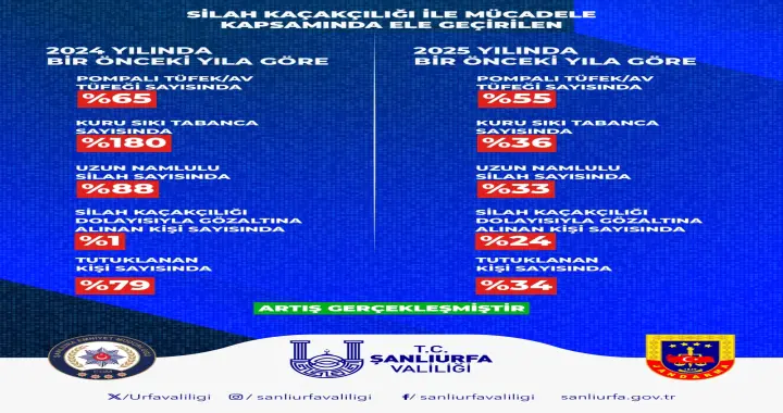 Silah kaçakçılığı ile mücadele kapsamında; 2024 yılında bir önceki yıla göre ele geçirilen pompalı tüfek/av tüfeği sayısında yüzde 65, kuru sıkı tabanca sayısında yüzde 180, uzun namlulu silah sayısında yüzde 88 artış yaşanırken silah kaçakçılığı dolayısıyla gözaltına alınan kişi sayısında yüzde 1, tutuklanan kişi sayısında yüzde 79 yükselişe ulaşıldı. 2025 yılında ise bir önceki yıla göre ele geçirilen pompalı tüfek/av tüfeği sayısında yüzde 55, kuru sıkı tabanca sayısında yüzde 36, uzun namlulu silah sayısında yüzde 33 artış yaşanırken silah kaçakçılığı dolayısıyla gözaltına alınan kişi sayısında yüzde 24, tutuklanan kişi sayısında yüzde 34’lük bir veri elde edildi.