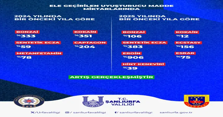 Ele geçirilen uyuşturucu madde miktarlarında 2024 yılında bir önceki yıla göre bonzaide yüzde 333, kokainde yüzde 351, sentetik eczada yüzde 59, captagonda yüzde 204, metanfetaminde yüzde 78 artış sağlanırken; 2025 yılında bir önceki yıla göre ise bonzaide yüzde 106, kokainde yüzde 12, sentetik eczada yüzde 383, ecstasyde yüzde 156, eroinde yüzde 906, esrarda yüzde 75 ve Hint kenevirinde yüzde 39 artış gerçekleşti.
