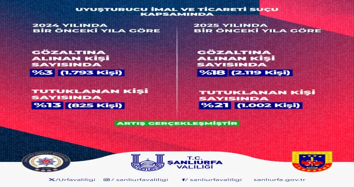 Uyuşturucu imal ve ticareti suçu kapsamında; 2024 yılında bir önceki yıla göre gözaltına alınan kişi sayısında yüzde 3 (1793 kişi), tutuklanan kişi sayısında da yüzde 13 (825 kişi) artış kaydedilirken 2025 yılında bir önceki yıla göre gözaltına alınan kişi sayısında yüzde 18 (2119 kişi), tutuklanan kişi sayısında da yüzde 21 (1002 kişi) verilerine ulaşıldı.